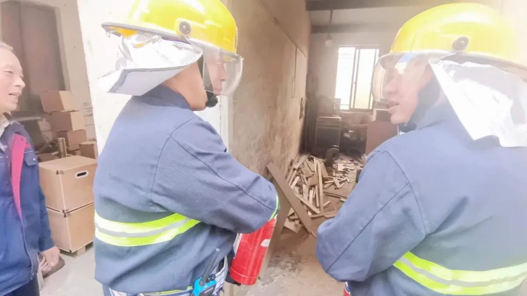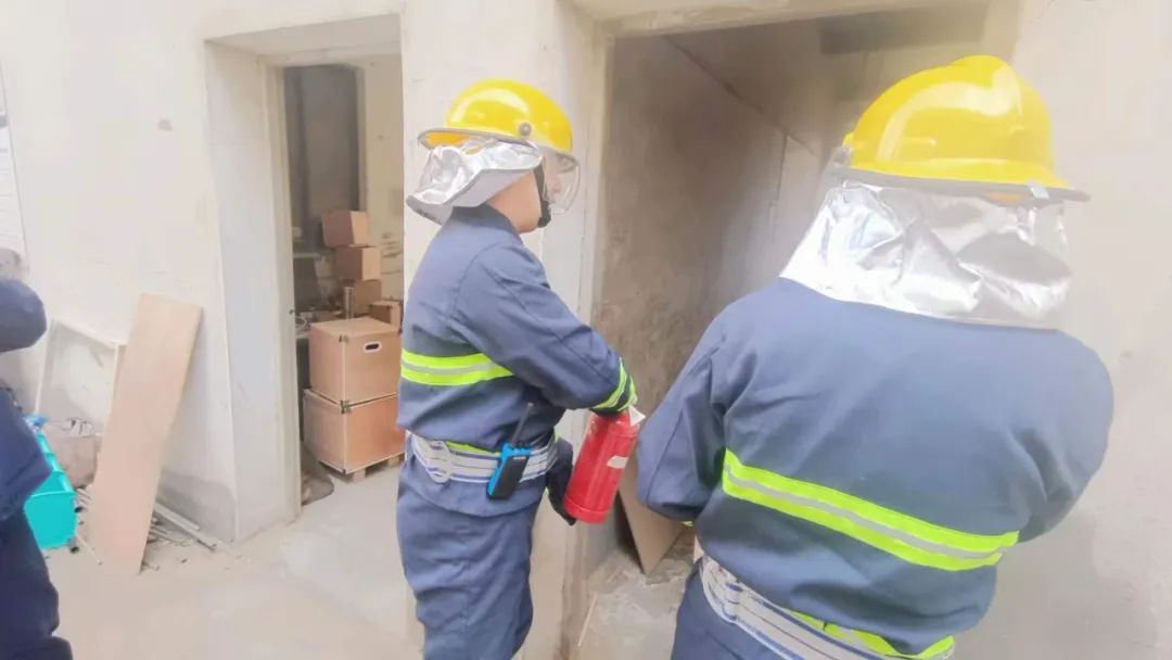 現(xiàn)場(chǎng)處置小組出動(dòng),到達(dá)災(zāi)害地點(diǎn),使用就近消火栓進(jìn)行滅火。